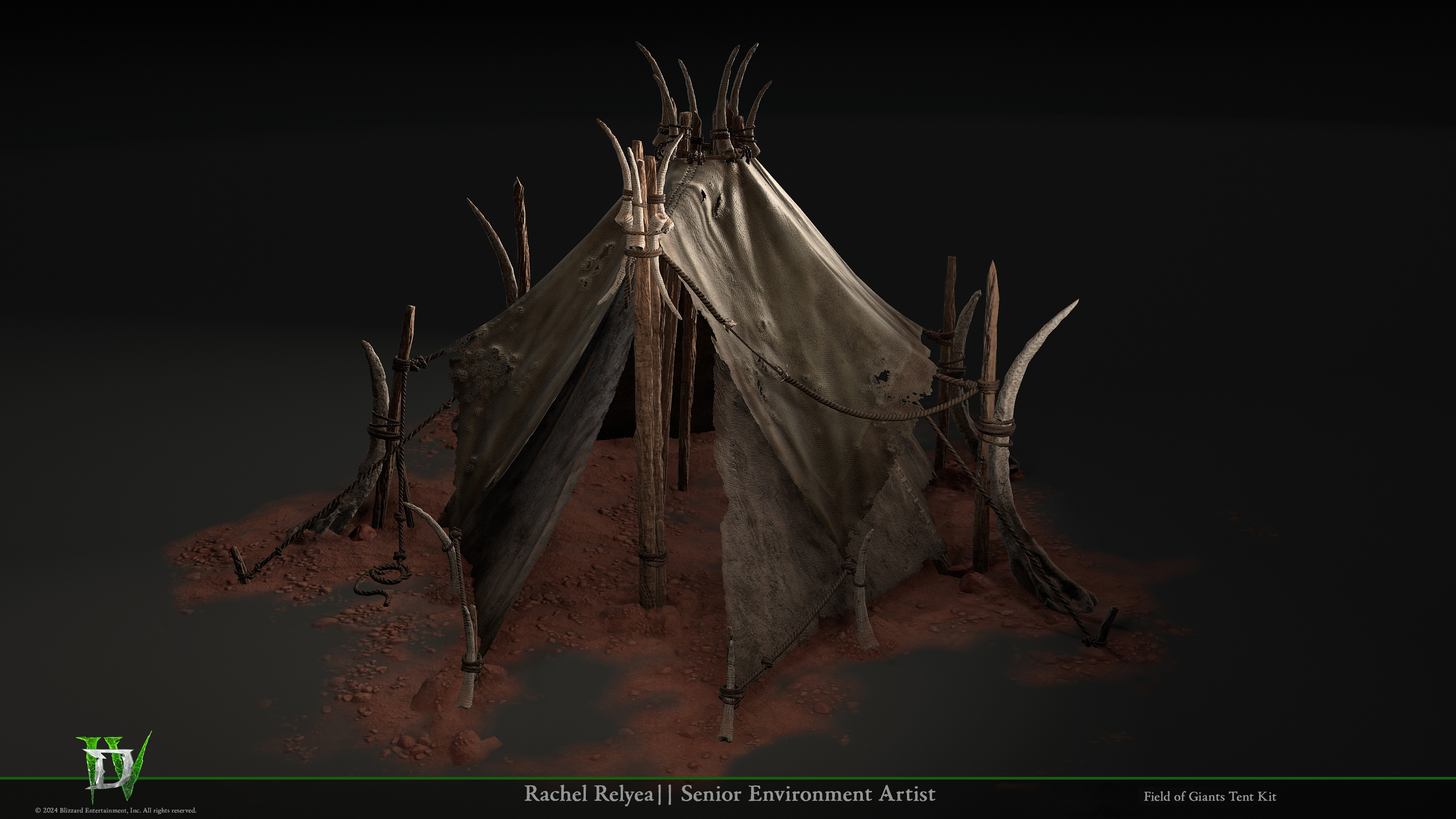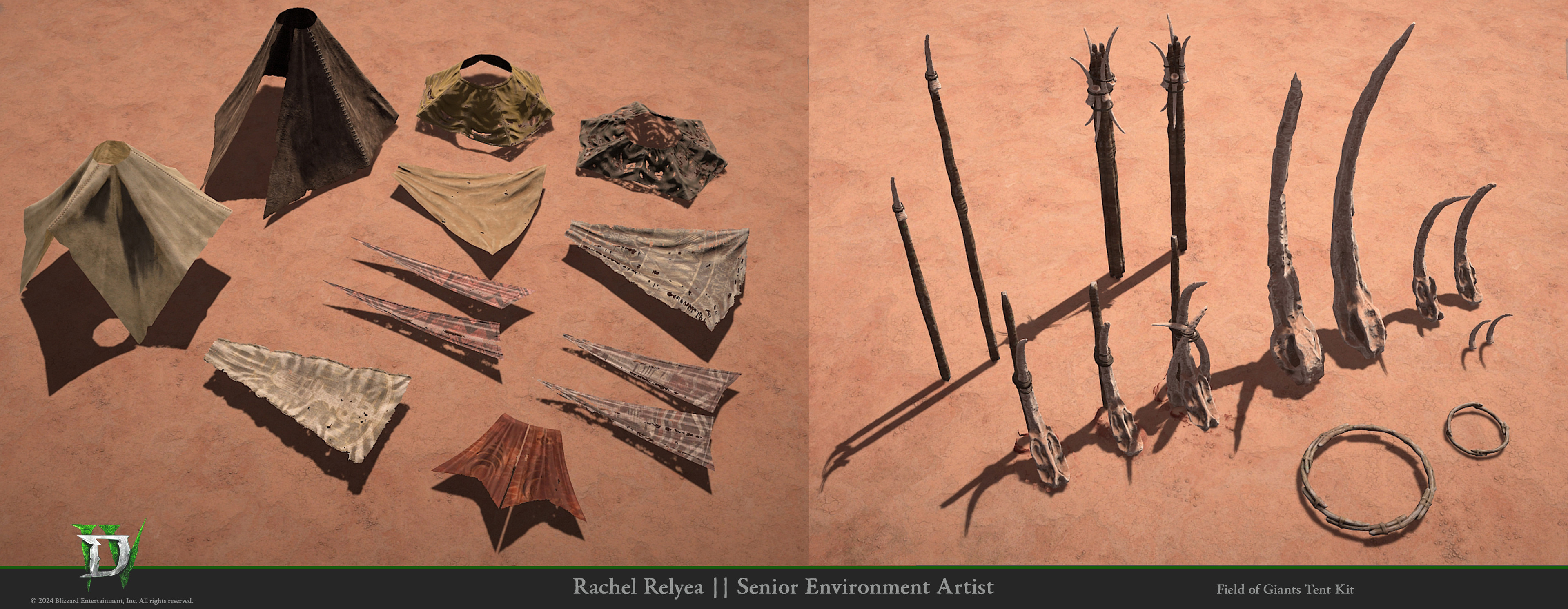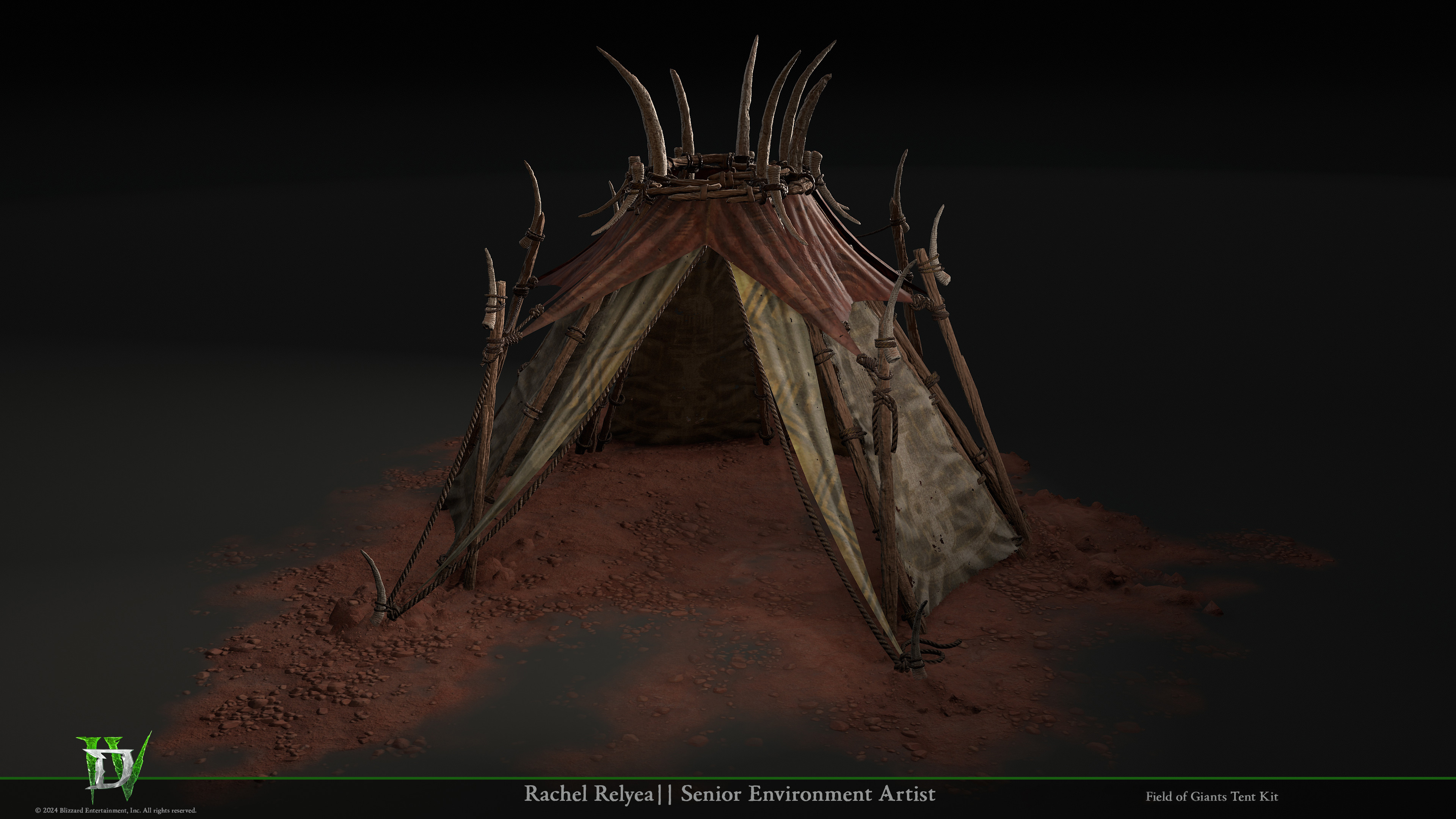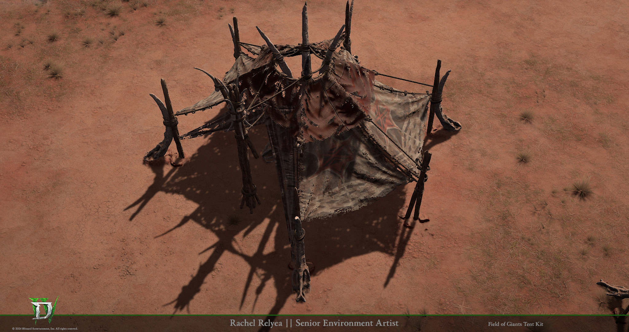 Tent kit I created for the Field of Giants area in the Diablo IV expansion, "Vessel of Hatred." I was responsible for modeling, texturing, and creating materials for all the parts of the kit, ensuring the kit had sufficient variety to create multiple tent variations, and then putting the pieces together to create several tent prefabs to be used by the worldbuilders. I also worked with level design to account for the footprint of the tent prefabs to make sure they did not interfere with the navmesh or game mechanics.