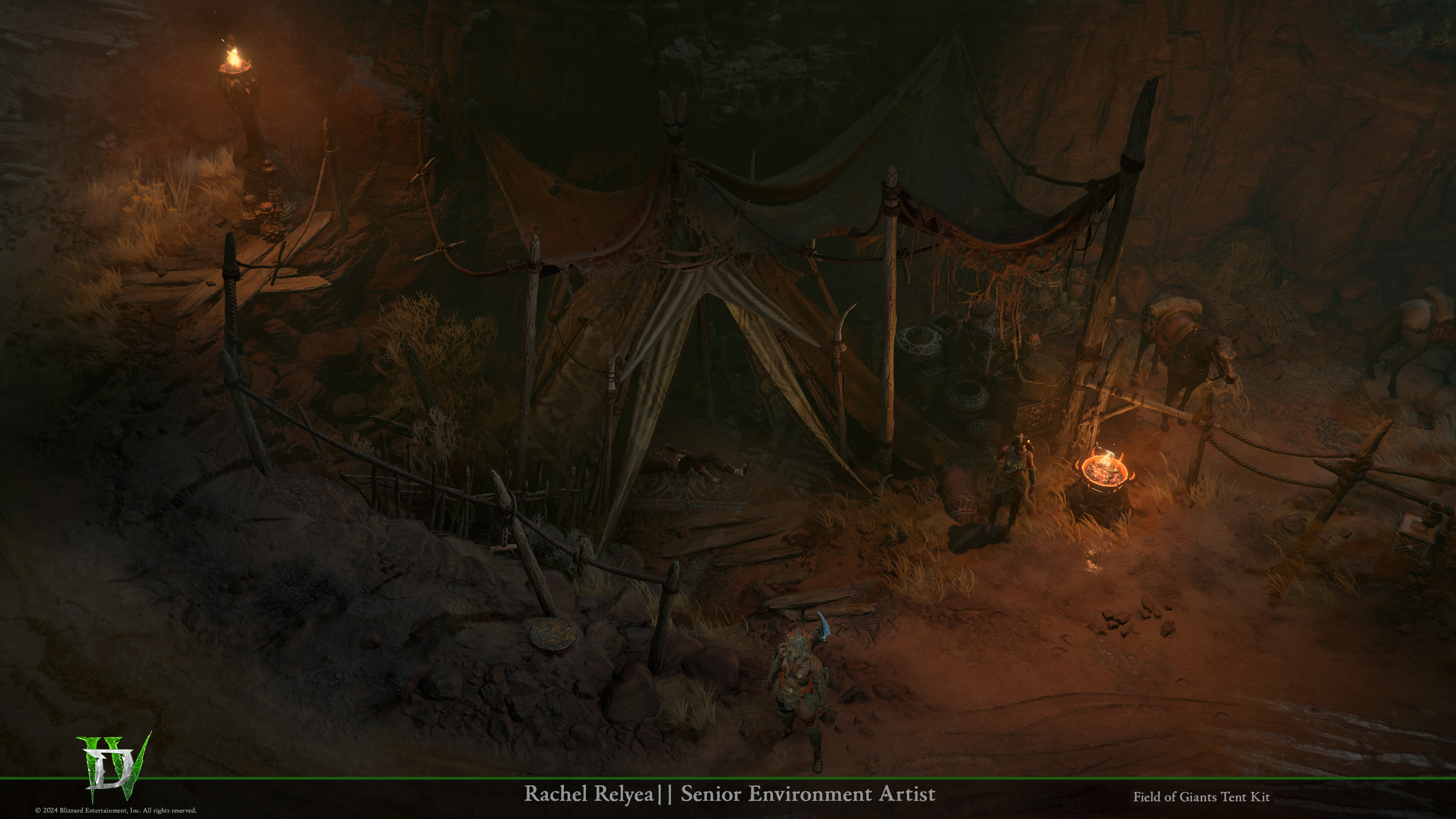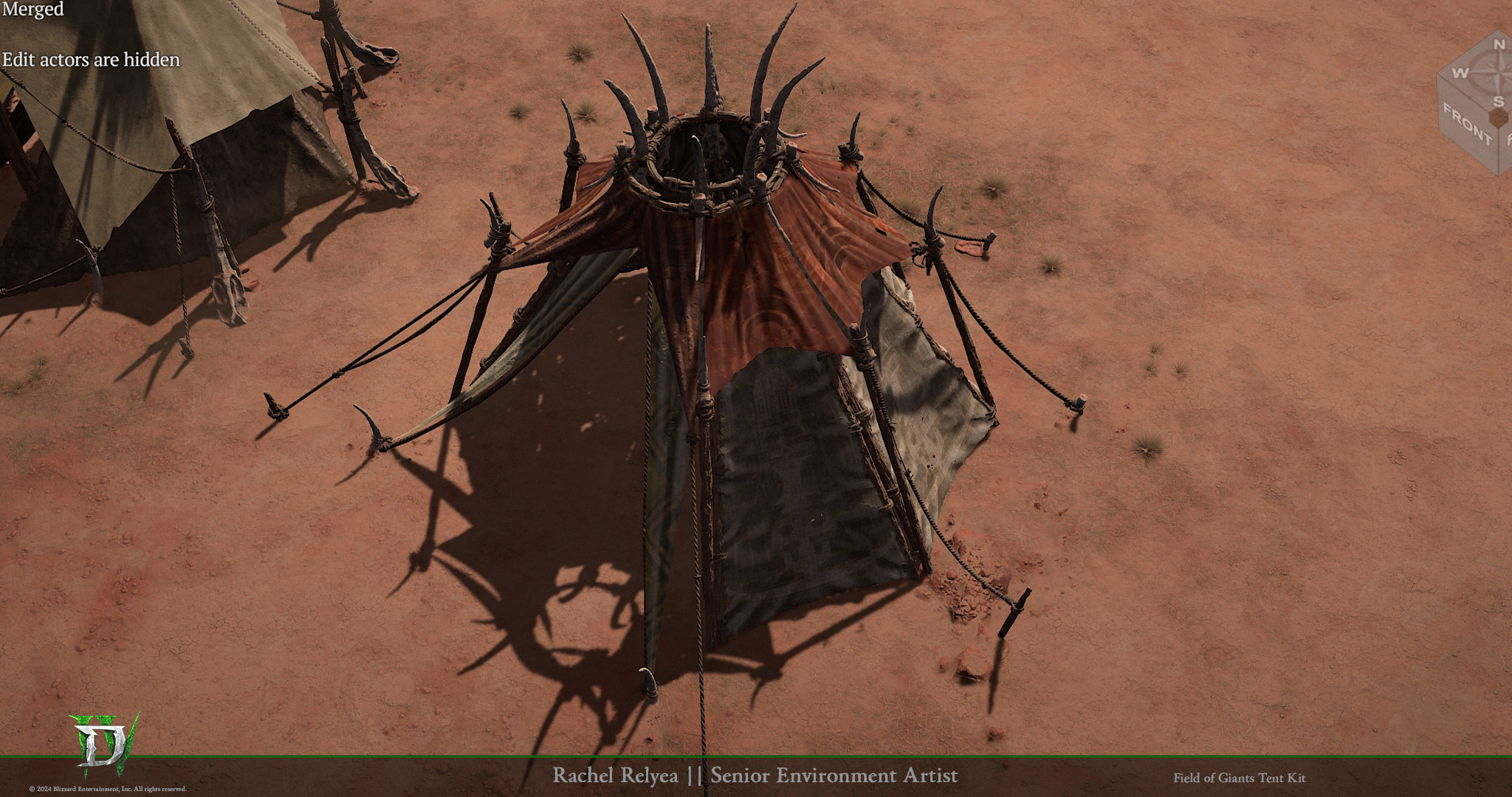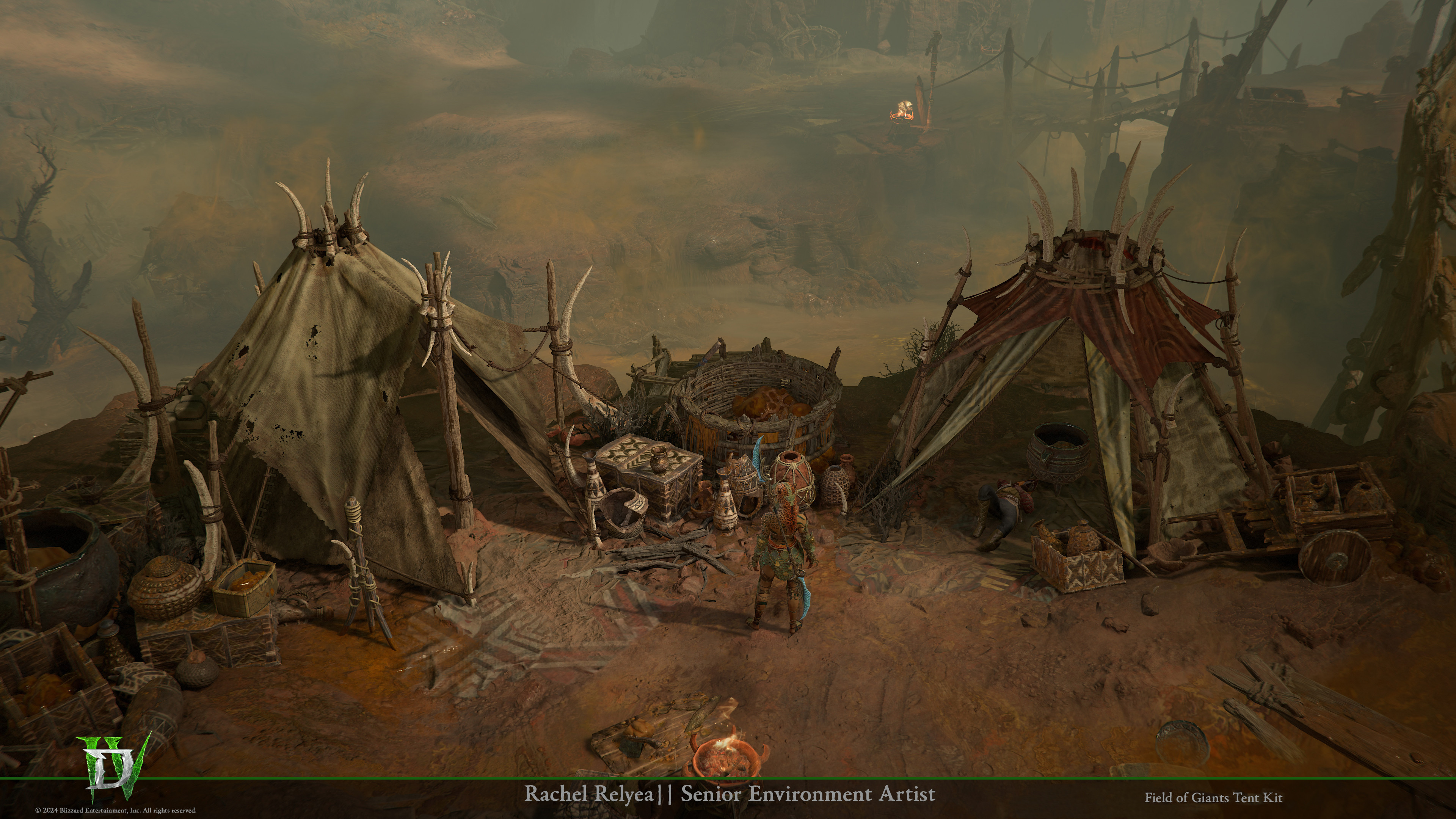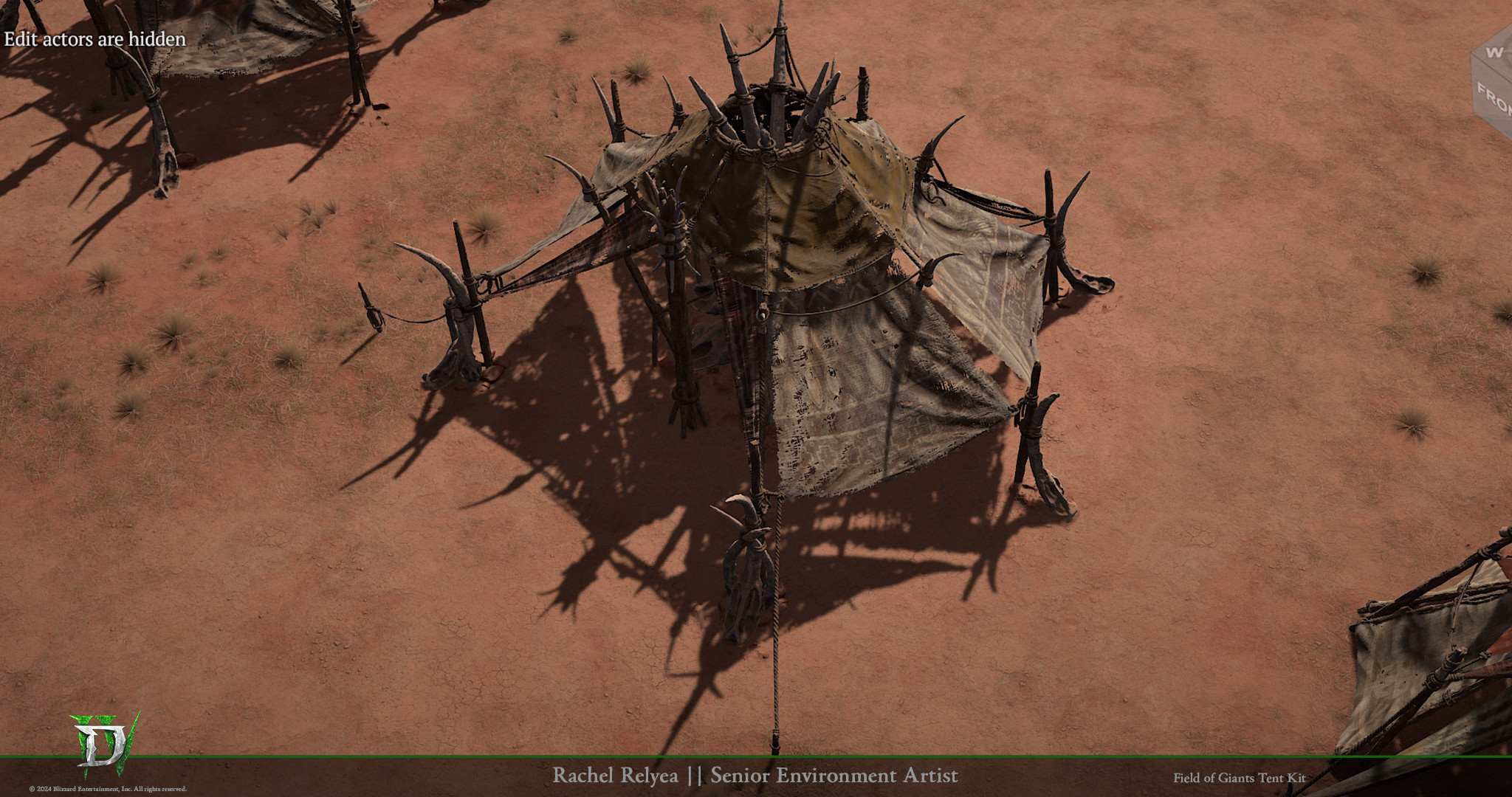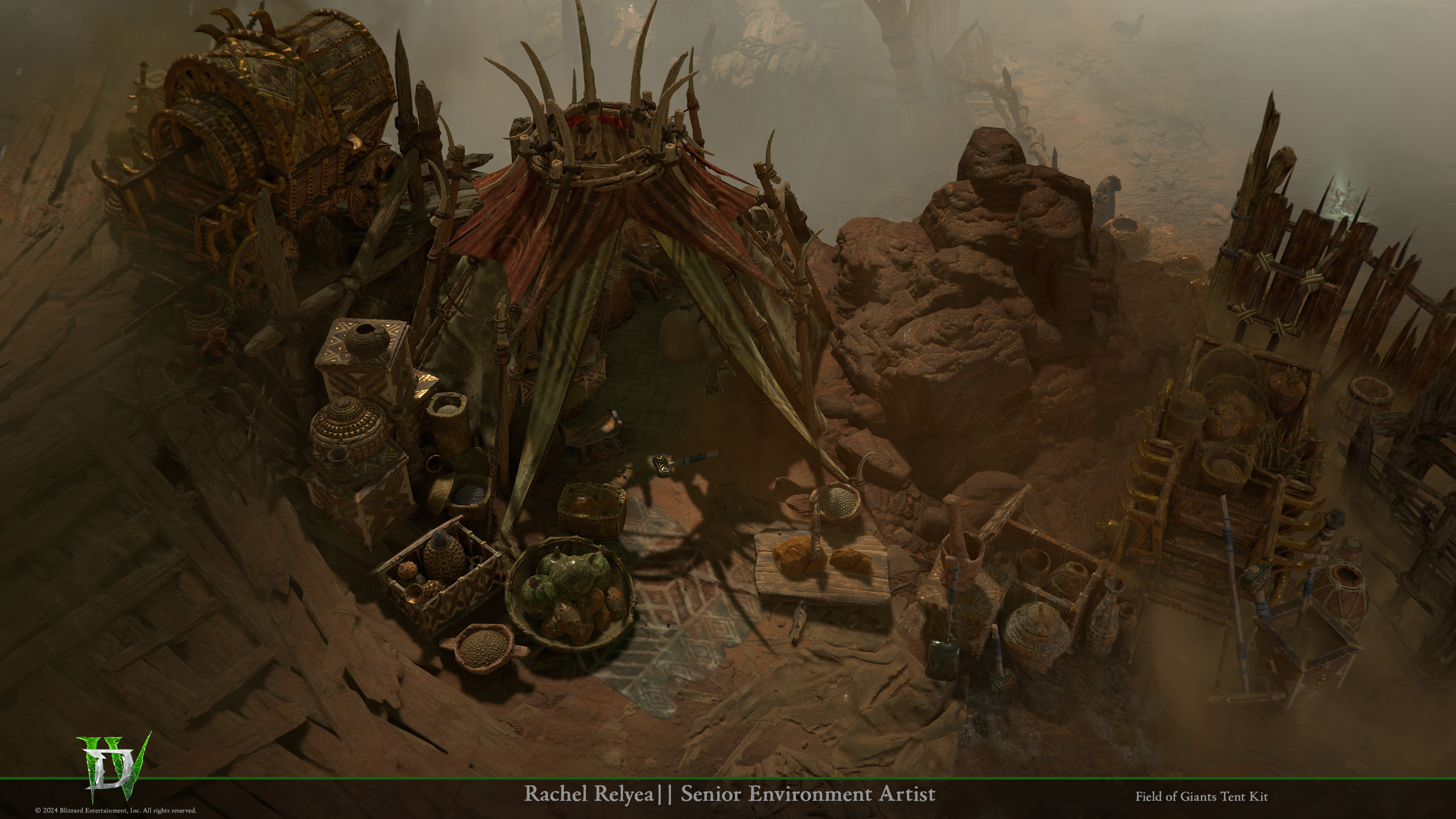 Tent kit I created for the Field of Giants area in the Diablo IV expansion, "Vessel of Hatred." I was responsible for modeling, texturing, and creating materials for all the parts of the kit, ensuring the kit had sufficient variety to create multiple tent variations, and then putting the pieces together to create several tent prefabs to be used by the worldbuilders. I also worked with level design to account for the footprint of the tent prefabs to make sure they did not interfere with the navmesh or game mechanics.